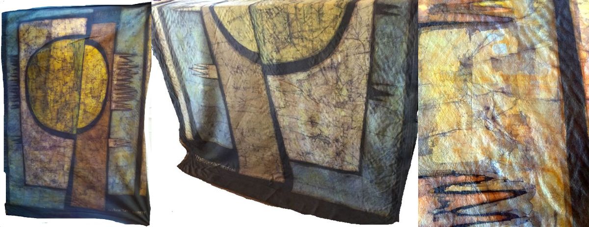 There’s something about this piece that is simmering under my skin. Part of it i suppose, is the more “natural” colours, though it was done with Procion in the days it first was available to artists. The shapes are evocative as well, suggesting trees, branches, a rising moon (setting sun?), but it could be an aerial view also of field, road and pond. (Hmm, but trees and roads are spines also, one holding the land, the other joining the flesh of city and country.)