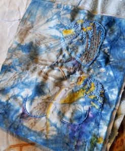 I was going to do just the indigo blue “crackle” stitching on this lovely figure, but decided that since she is a mother archetype for me, that the roots could strengthen the story. The moon will reflect on her, and she on the moon, and the mountains and river will enter the story easily as well.