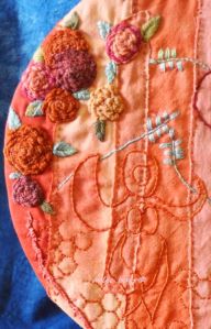 Abundant Goddesses in a rose garden, this hand embroidered and naturally dyed “tondo” features predominantly madder in its wide array of shades and moods, with a brightener of privet for the leaves and vines. Shop! 🙂