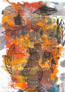 In the annual purge that takes place in January, i found an old “mark making” journal. A period of mixed media and a lot of colour, it was my antidote to living and working in my MIL’s basement, a horrible place and situation in many ways. “Notes from Mother Nature” was made in October of 2008.