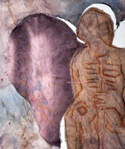 I didn’t want a seam down the middle, so i tore one chunk in half and attached it to either side of the main fabric. This is going to be a large work, as you can see by the yardstick left in there for scale 🙂 (I’ll have to have an appropriately sized stretcher bar set custom built, as i haven’t this size in the stoodio!) The seams aren’t terribly obvious, because of the similar colourings and process, but they are there enough that i wanted to segue them into each other. Immediately, i knew i wanted to use my technique of melding the fabrics into each other with a multitude of seeded back stitch. (I used that technique a lot on “Ebb and Flow” from 2014, on the indigo pieces.)