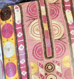 Technically, a “Suzani is a type of embroidered and decorative tribal textile made in Tajikistan, Uzbekistan, Kazakhstan and other Central Asian countries. Suzani is from the Persian سوزن Suzan which means needle. The art of making such textiles in Iran is called سوزن‌دوزی Suzandozi (needlework).”