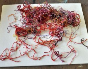 I threw some with other cottons in my 2 year old dried tansy pot (um, that would be just the tansy 2 years dried, not the pot 🙂 ) and just about screamed: look at that ORANGE!!!!