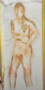 To show the scale, i gritted my teeth and had my photo taken with it, hanging at the 371 Gallery at the Alberta College of Art and Design (ACAD). I really don’t like getting my picture taken anymore, because it reminds me i am no longer a sweet young thing (yes, i was, a long time ago, and sometimes still, inside 🙂 ), but it *is* important that people see the Actual Real Artist on occasion!