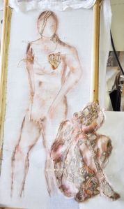 With the timeframe i’d had left to get work done for the end of residency show, i decided instead that since the owner of this work isn’t picking it up until near the end of September, that i could show this instead. Created with fabrics during my 2016 residency, and worked on during the 2017 residency, it suits perfectly in that respect as work done DURING res (because i have seen work in those shows that had nothing to do with res…which kind of defeats the purpose of the exhibition IMHO), and also, as celebrating 10 years of Contextural, it was a perfect opportunity for me to see and show how *i* have evolved in 10 years. (Though i have been a member for only 8!)