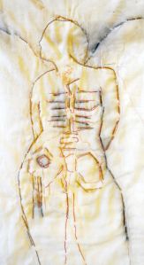 To show the scale, i gritted my teeth and had my photo taken with it, hanging at the 371 Gallery at the Alberta College of Art and Design (ACAD). I really don’t like getting my picture taken anymore, because it reminds me i am no longer a sweet young thing (yes, i was, a long time ago, and sometimes still, inside 🙂 ), but it *is* important that people see the Actual Real Artist on occasion!