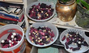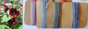 The moon is worked with cotton, silk, silk/wool blend and wool threads in cochineal, osage, logwood, and privet berries, with the brown of the seeds coming from potassium permanganate (actually an inorganic compound). I found a walnut bath i had stored several years ago, when i was setting up in the basement, and shall test to see if it’s still “live”, for some of my browns in future, though i do love all the permutations the PP gave on the skein of cotton. On the background surround, in cotton, silk, wool and silk/wool, the colours i used are privet berry, cochineal, brazilwood, rhubarb root, hollyhock (and that’s where the “oh-oh” happened, as some of the colours are so soft, they are barely discernible), osage, logwood, and sandalwood. Using pre-mordanting (VERY important), and post modifying methods, changes the colours to a wide range. (Ha, just realized i used none of the wonderful madder results!)