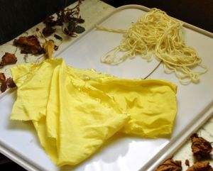 The first look was Meh. Yeah, it’s yellow, but barely worth the effort. (Though using dandilions is one of the EASIEST ways to get colour. But no, the roots will NOT give you any GD magenta, ever, ever. EVER.) Then i threw in a pinch of soda ash–BOOM. YELLOW. DANDILION YELLOW. Wowzers, it’s neon, electric, it’s definitely a Spring colour. (Paler yellow wool yarn at top is without the soda ash.)