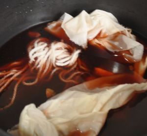 All the fibres were correctly premordanted according to type (cellulose and protein). They were done according to Carol Lee’s clear instructions from“Dyeing with Avocados, Food for my Dyepot”, Fall 2002 Spin-Off Magazine, but they are not Hass avocados, so blah blah blah.