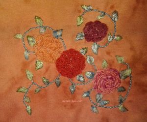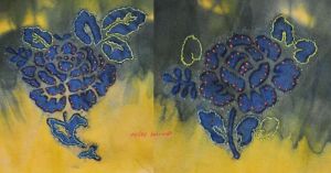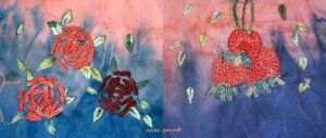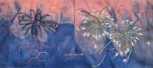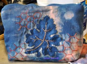 Hand embroidered in cotton, silk and wool threads, naturally dyed with oak, osage, privet, walnut, madder, pomegranate, cochineal, indigo and sandalwood, on an ecoprinted and indigo dipped cotton, background madder and indigo on cotton. Some metallic threads are also featured, because even natural likes a bit of bling once in awhile!