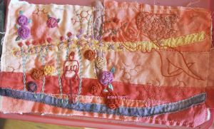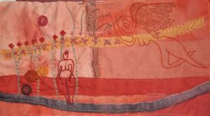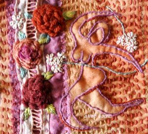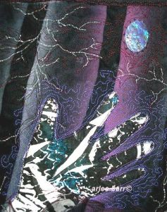 That’s a page from a 2007 “fabric art journal”, a time for me of experimenting and heavy machine embroidery. “Kirlian Hand” is a portrayal of the so-called phenomena of a person’s “aura”. Named after Semyon Kirlian’s accidentally discovered observation in 1939, that if an object on a photographic plate is connected to a high-voltage source, an image is produced on the photographic plate—- and touted in the 70’s as captures of the human spirit! (My ex was heavily into this, Hollow Earth theory, pyramid power, Chariots of the Gods alien conspiracy, and the whole “new age” crapola of the time….used to drive me nuts…but then *he* was/is.)