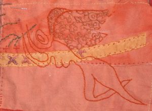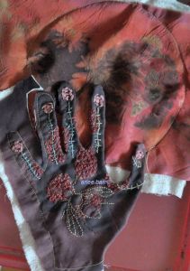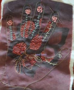 Anyhoo, i did like the design possibilities of this, so wth. The hand was cut from screen printed fabric, all of the embroidery is by free motion and the abalone shell piece was attached with glue and beads (i think..the page is somewhere in a box with other relics of the time, in a little room at the back of the house so stuffed i can’t get into it. Note to self: do something about that this weekend, there’s some Good Stuff in there too…)