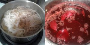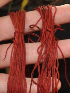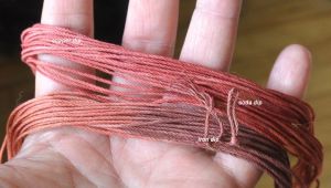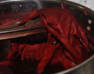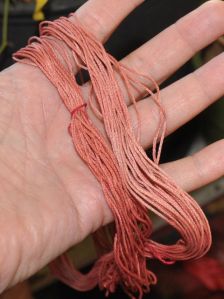 Oh so close to disaster! My brain must have done a fancy flip of some sort, because on Saturday i was bemoaning to Greyman, that i couldn’t seem to get the madder pot to 140C. He most emphatically with gestures and other well chosen words reminded me that boiling point of water is 120C, and WHY WOULD I WANT IT THAT HOT????? Oh BUGGER…that’s the Fahrenheit temp, the Celsius should be 60!!!!!!!!!!!! I whipped the pot off the burner just as it reached 70C, and fortunately the short time at that temp doesn’t seem to have hurt the results too much. (Too high a temp with madder, and you destroy the reds, and get browns only.)