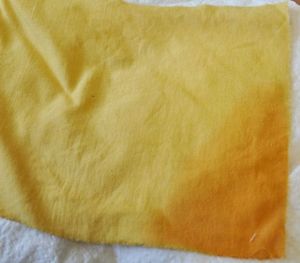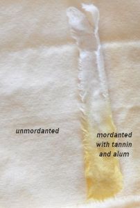 A funny little tip for you, if you A. properly mordant your fabrics (but forget if they’re finished when you pack them away) and B. keep a wee tiny jar of Titanium oxalate, then you’ve got a handy dandy little tester for mordants. Tear off a tiny strip of the fabric, dip the end in the TO, and if it turns bright yellow, it’s mordanted with alum (silk) or alum and tannin (cotton). If it’s pale pale cream, it’s unmordanted!