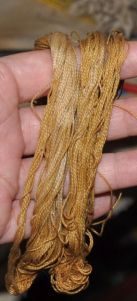 Because the pot is so full of leaves, the thread was somewhat constricted, so the dye job is a bit patchy in uptake, which is okay because i love variegated threads π This is still wet in the photo, but isn’t it a pretty gold?