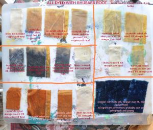 Rhubarb root has more of an affinity for protein fibres though: all the trials i’ve done on cotton or linen gave at best, a pleasant warm toned pale yellow, and even post modifying doesn’t change much of that. (Except for iron which which pretty much *always” turn any natural dye to shades of charcoal!)