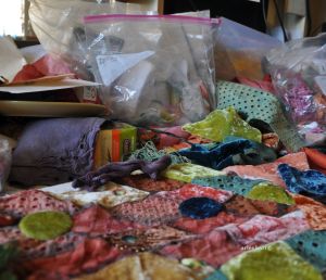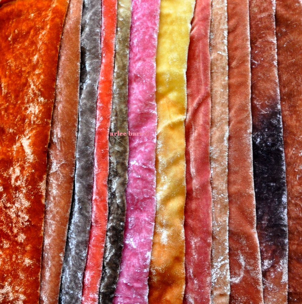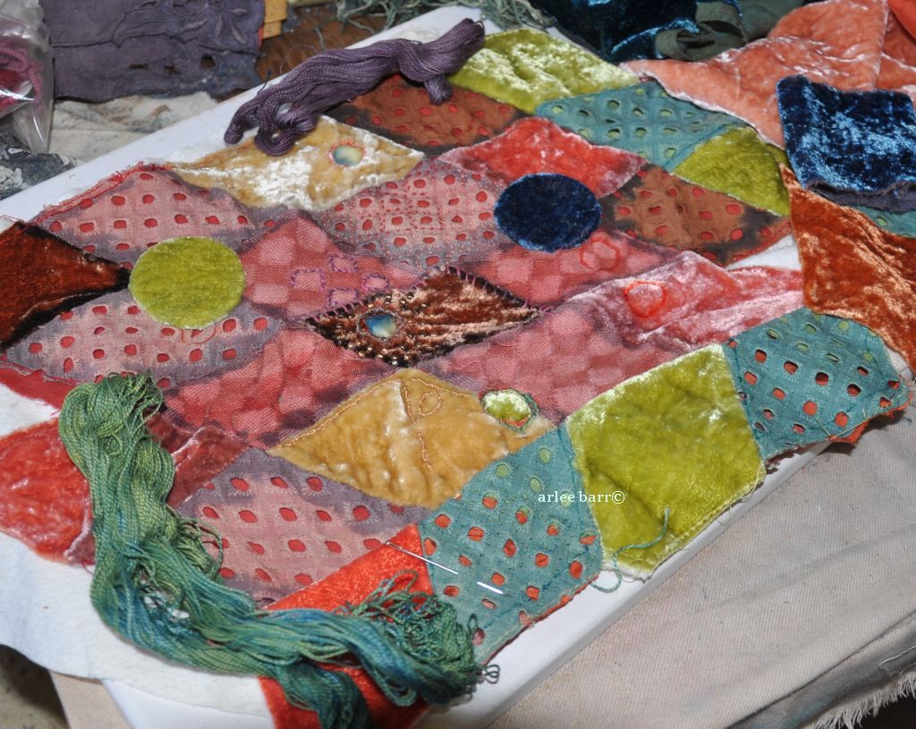 Trees and moons and Spring are on m y mind–though *that* is far away right now, with -21C to -25C projected for this coming weekend. (My son has been in Uganda since the beginning of November–is he gonna get a shock, trying to climatize again to Alberta weather, after almost 2.5 months of African heat!) I’ve picked an indigo overdyed osage cotton, 2 different velvets for another blue moon, a previously screensprinted and then stencilled indigo cotton, and a hunk of the most wonderful chartreuse velvet i only hope i can replicate again! That one is the right side and you may notice a funny bit of photo editing to show the correct colour, a square of green set in the yellow–it ain’t yellow, but the studio is so wrong for photographing colour, and i was too pooped to drag everything upstairs and anyways, it’s a grey snowy day, so bear with me ๐