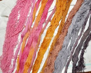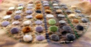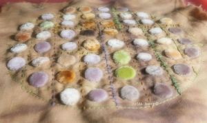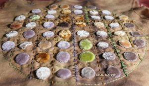 I had revved up my indigo vat again on the weekend past. (Actually i had to start from scratch as the originals had to be dumped for the move…..too little to save, and too much chance of spillage or oxygen overload as it sloshed on a truck!) First results were not encouraging, but after asking in an indigo group what the problem might be, have concluded it might have been the tannin premordant, *and* the cutch, which is *also* a tannin. See the grey around the darker marks of indigo? (All photos in my posts are clickable for larger viewing.) I like the effect, but if it doesn’t “stick” well, it’s not a good practice if i wish to flog my goods later! (It also appears to have stripped the madder…)