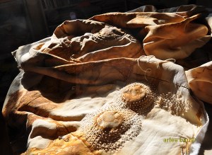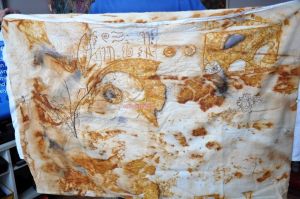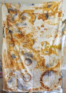 Iron was integral here as a mordant. Iron deepens and “saddens” colours, can shift to deep purples, blues, garnet, greens, greys and browns, depending on the dye used. (In this case, brazilwood.) It can weaken fibres as well, if the concentration (know as WOF, or weight of fibre ratio to mordant/dye) is too high. I’m pleased to say the fabric still seems quite strong, despite the heavier rust concentrations, though of course, i’m not swinging from the chandelier to test the fact 🙂