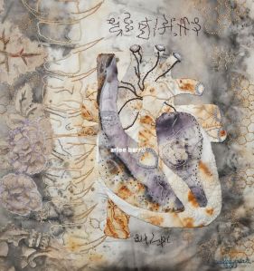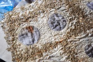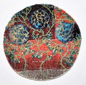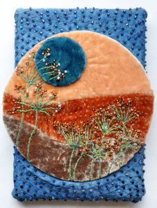 The Mini Goddess Moons, 2018, lavender leaves on 3 of them. (These are *completely” done in natural dyes, both fabric and threads.) I like the way the lavender gleams amongst all the stronger natural dye colours.