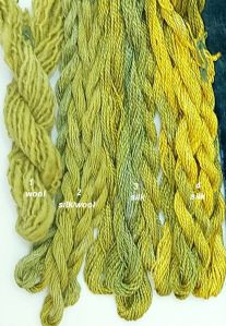 Luxe threads for stitching along and on Mossy banks! A mix of wool, silk and silk/wool in clear crisp greens and yellows dyed in historically accurate processes with osage and logwood.