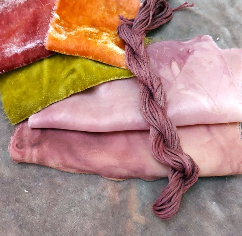 This pack includes silk noil, cotton velveteen and silk/rayon velvet, solid and streaked and mottled, with osage and logwood dyed in historically accurate processes, giving elegant calming blues and soft Monet mossy yellows and greens. (Note, threads are not included, just to give you an idea of depth of colour. Threads will be in a different listing!)
