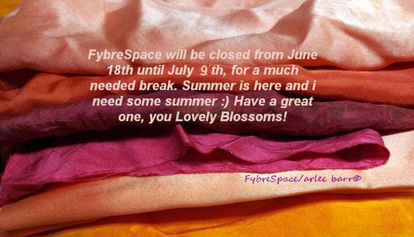 FybreSpace will be closed from June 18th until July 9th, for a much needed break. That means NO purchasing allowed at all until i come back, because i figure no one will want to wait 3 weeks for something to be shipped to them!