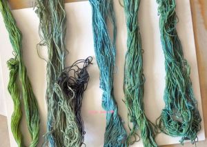 Because the pot is so full of leaves, the thread was somewhat constricted, so the dye job is a bit patchy in uptake, which is okay because i love variegated threads 🙂 This is still wet in the photo, but isn’t it a pretty gold?
