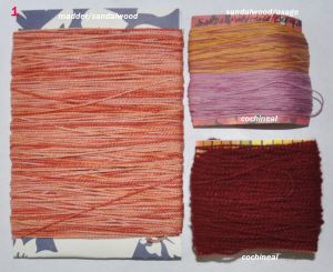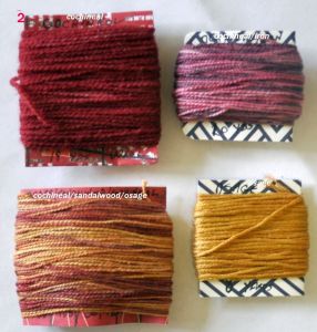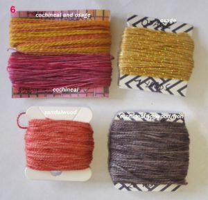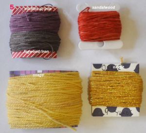 All of these have been properly prepped, premordanted and dyed according to well researched practices, and historically accurate methods. NO BEETS< NO BLACK BEANS<NO FUGITIVE “DYES!!!!!!!!!!! I haven’t cut any corners just so i can make some coin, as i intend to use bits in my own work–and why short myself?! All of course, are natural fibres, in various weights of silk and cotton, as are the threads. All have been well rinsed after, and because they are done correctly to begin with, there should be no bleeding. Your methods of care may influence the colour, but not out of the ordinary. (Even synthetics can fade…) All natural dyes should be treated with care ie, minimal sun exposure (you can wear it once in awhile at a sunny festival, but not everyday), proper wash handling, which means hand washed with a NEUTRAL soap (Dawn Original dish soap, believe it or not, is perfect, and is what i use), and storage in a closed drawer, closet or box. This all being said, if you are adding it to your stash to use in art textiles, rather than wearables, well, most of that doesn’t apply, except for the sun exposure. Nobody hangs a painting where sun will hit it, and neither will you with your art, will you? π