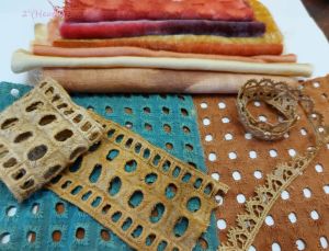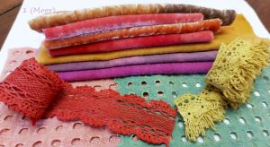 I’ve been farfing around with some new natural dye colours —-LOVE Lac for its wide range of reds, purples and pinks, similar to my Quebracho Rojo results, but feeling somewhat warmer on the colour spectrum. I also simmered up a batch of dried out eucalyptus that i bought way back in August of last year, set on a shelf in some water and then promptly forgot it was there/anywhere—this is the first time i’ve got some warm yummy sunset-ty orangey yellows and am just in love with it. Of course, the next batch i will buy will be different! I’d tried previously and got a rather insipid butter so am rather chuffed with this batch, especially on the cotton lace trim. I think it will go nicely with some of the indigo dyed lace, cotton or rayon, and silk on the first wearable art piece i’ve planned. (That got sidelined a bit with Life Happening, but i have a desktop photo to remind me how much i love the idea, and to GET TO IT!