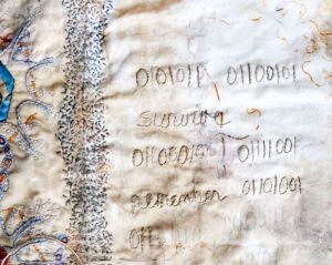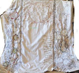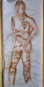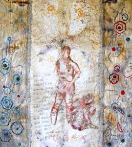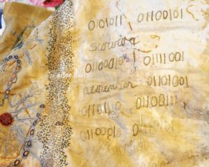 With the timeframe i’d had left to get work done for the end of residency show, i decided instead that since the owner of this work isn’t picking it up until near the end of September, that i could show this instead. Created with fabrics during my 2016 residency, and worked on during the 2017 residency, it suits perfectly in that respect as work done DURING res (because i have seen work in those shows that had nothing to do with res…which kind of defeats the purpose of the exhibition IMHO), and also, as celebrating 10 years of Contextural, it was a perfect opportunity for me to see and show how *i* have evolved in 10 years. (Though i have been a member for only 8!)