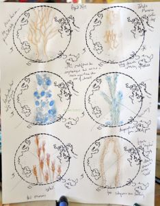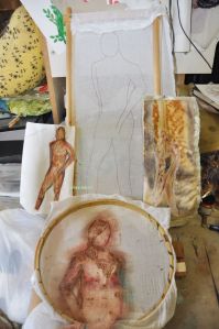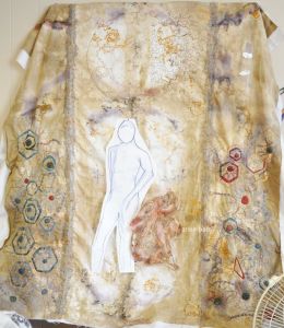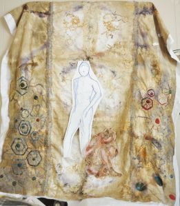 The second figure for this piece has been a bit problematic. The original sketch’s colouring (above centre right) did not translate well the first time to the haremcloth—too green, too dark. The sampling (above centre left) was actually done before the large attempt at the stitching, but i lost sight of what it was and didn’t go to the now aborted attempt with it.