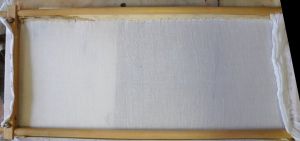 The tapestry frame worked a dream for stretching the expletive deleted haremcloth, keeping it taut and 99% on grain. I’m sure any nun or lace maker would agree that the 1% should be more important, but considering the piece when done will be loosely attached to the main background, subtle stitch manipulation will true it up.