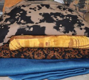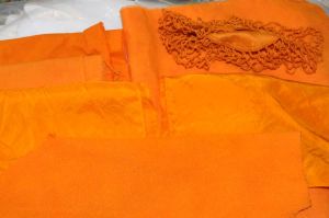 The blue piece is the only piece that we mis-identified–we thought it was a sueded silk, but alas, it’s polyester. That being said, it will be great for binding edges and slivers of detail. The yellow rayon may possibly be overdyed with indigo. The top fabric, also a rayon, will have some of the motifs embellished and accented somehow, and/or overdyed.