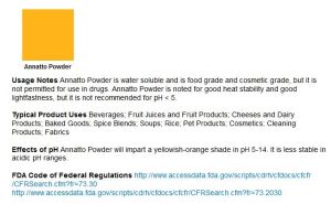 And note, supposedly, annatto used as a food colouring has been linked to certain childhood behaviour disorders, and can cause an anaphylactic reaction in some!!!! As always, just because it’s Natural, doesn’t mean it’s safe for Everyone.