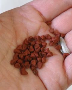 EDIT: This dye material is INCREDIBLY POTENTLY STRONG. It immediately stained my stirrer, and at 3TBSP per 3L water, i’m pretty sure that next time, i’ll use much less, perhaps even “thirding” the amount of seeds to water. Of course i got a LOT of dyed fabric from this pot!!!!!! (I also did not cook and grind into a paste, as some do, as the seeds gave up their colour readily without a messy extra step. I suspect this was the influence of the soda ash–before i tossed that in, the seeds just laid sullenly at the bottom of the water, with no bleeding.) And sthere’s still a lot of colour left in the bath, so i’ll decant that into something dark and airtight, dry the seeds, and store all for the next use.