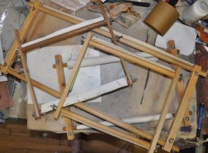 The largest frame is the PERFECT size so that i can finally do the standing figure for “Tabula Memoria”, without struggling to keep the grain straight–my largest hoop would have necessitated moving the fabric in and out of the grip, and that would have meant the grain would surely have been off on the damned haremcloth. (Love AND hate that stuff!)