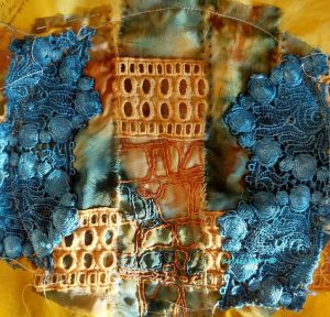 Original Truths, detail 2, hand embroidery on cottons, natural dyes and rust processes, 20×31″