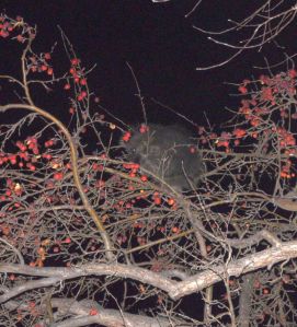 And last night, we discovered that porcupines can really really climb! The apple tree is at least 20+ feet tall, and here he is, at about 15 feet, munching on apples.