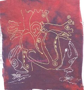 8″ across, natural dyes on linen, cotton, silk/wool, silk/rayon