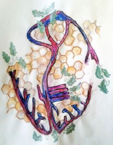 Most of us have a personal symbol system, whether motif, shape, object, colour or even stitch, that marks our work, makes it ours and is ultimately satisfying. Mine are anatomical (hearts, brain, spine/bones) or nature inspired (bees/roots/branches/moons), and the hexagon shape, quite ubiquitous in a lot of my work. Hexagons, in my lexicon, are cells, microscopic flora and fauna, hives, memories, all symbolizing at a basic level, connectivity.