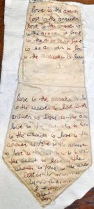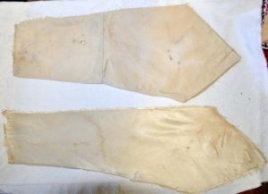 So, anyways, off the box again 🙂 Mo sent me one of the “pennants” to do with as i wish. (The fabric is from a very old wedding dress.) I took it apart first, as the layers can be re-assembled when the work is done.