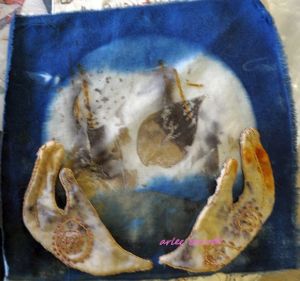 I did an alum pre-mordant, assuming the cloth was silk, but there was no madder dye uptake, then realized it was a synthetic after a burn test spattered some on one of my fingers! Then i spent two weeks dithering about what i was going to do next, staring at it, shuffling bits on and off it, having multiple “Eureka” moments that withered very very very fast, and thinking i was going to completely ruin it —–and Mo was going to politely say “oh that’s interesting” while privately wondering why the hell she had sent the original to me at all…….
